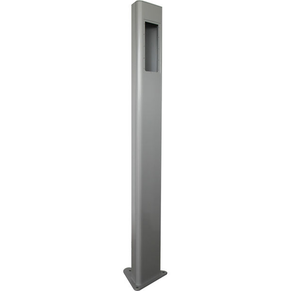 Potelet tout aluminium Hauteur 1,5m Teintes RAL gris alu 9006 Fixation sur platine au sol par 4 chevilles Ø 12 non fournies Avec découpe pour XE2 PM petit Format