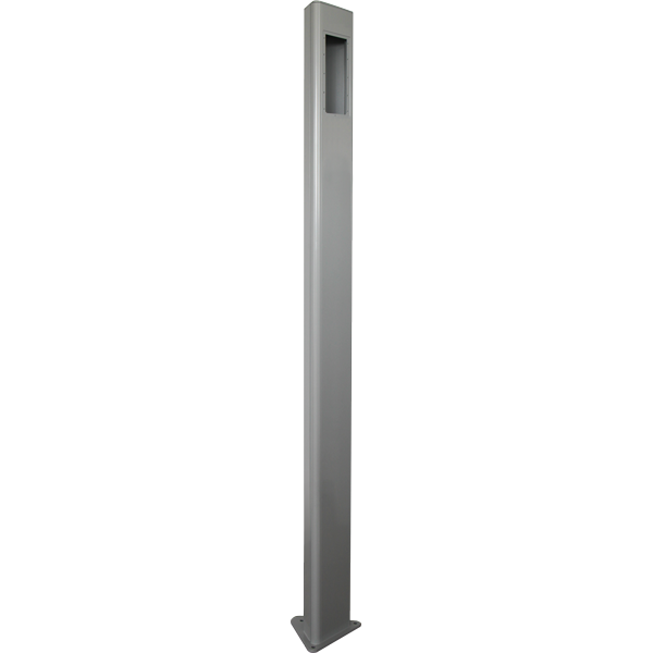 Potelet tout aluminium Hauteur 2,20m Teintes RAL gris alu 9006 Fixation sur platine au sol par 4 chevilles Ø 12 non fournies Avec découpe pour XE2 GM petit format