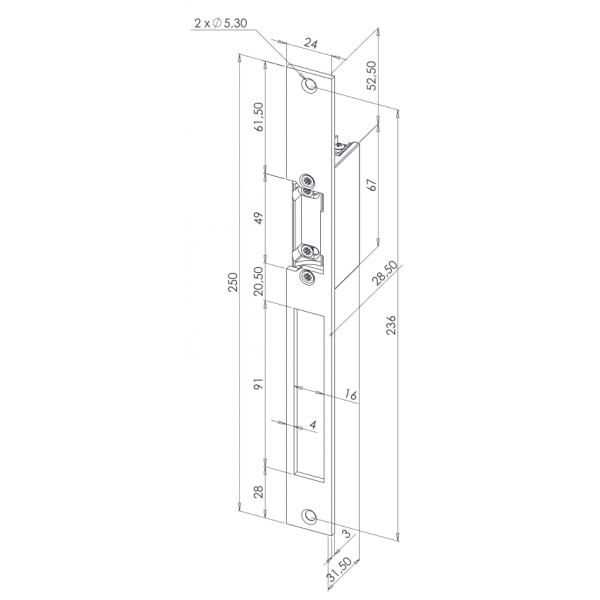 D'une longueur de 250 mm, cette têtière peut être indifféremment montée en DIN droite ou DIN gauche sur les vantaux. La fixation de la têtière se fait par deux vis haut et bas. Sa largeur de 24 mm permet une intégration facile dans les gorges des menuiseries en aluminium ou en métal.